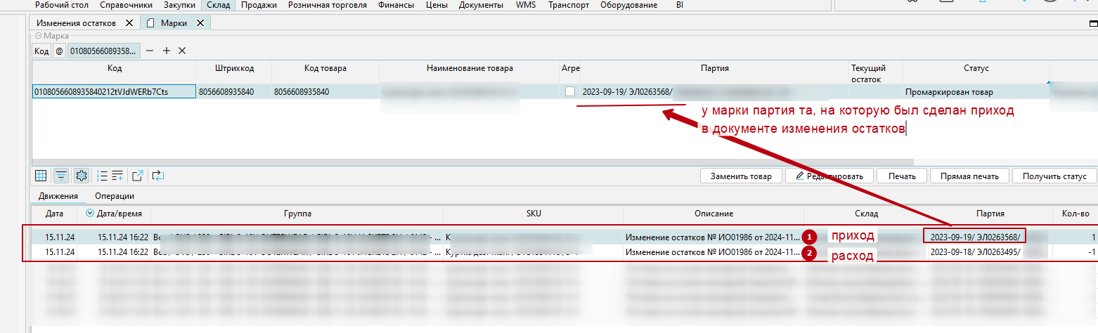 4) Сохранить и провести документ изменение остатков, после этого можно увидеть в движении марки - расход по одной партии и приход на другую, так же у самой марки партия будет отображена та, на которую был приход