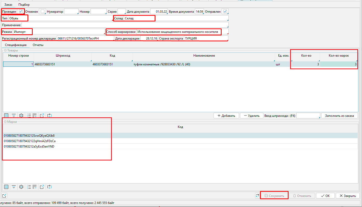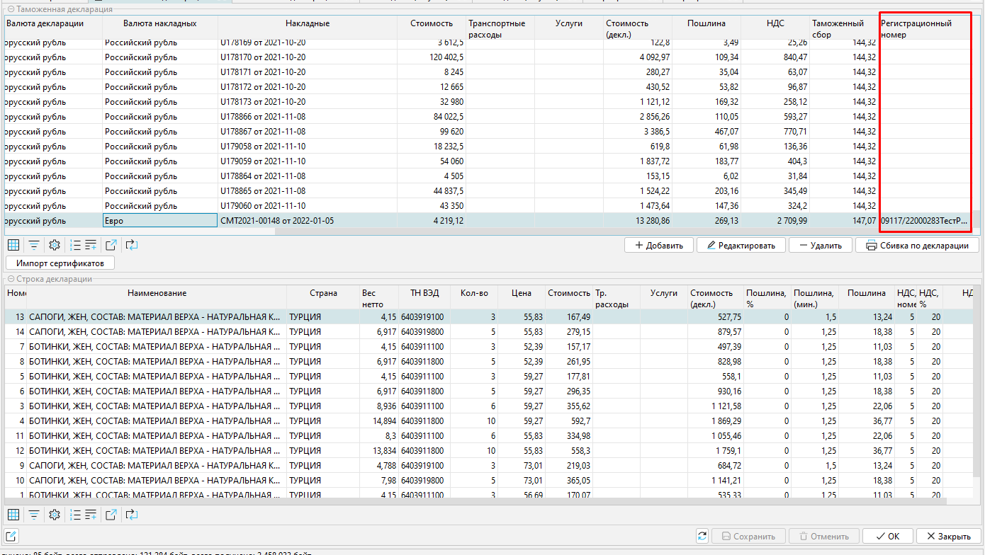 При маркировке импортированных товаров, необходимо в ЭЗ предоставлять информацию о регистрационном номере таможенной декларации. Эти данные указаны в декларации в поле Регистрационный номер и отображаются в списке деклараций.