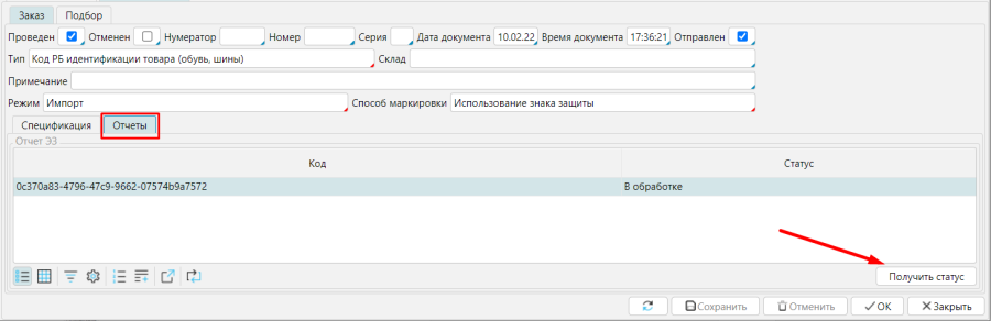 При успешном обмене в ГИС ЭЗ будут созданы отчеты по маркировке для каждого GTIN. Информация по отчетам будет доступна в документе маркировки на вкладке Отчеты. Статус отчета обновляется по кнопке Получить статус. Когда отчет переходит в статус Выполнен, КМ введены в оборот.