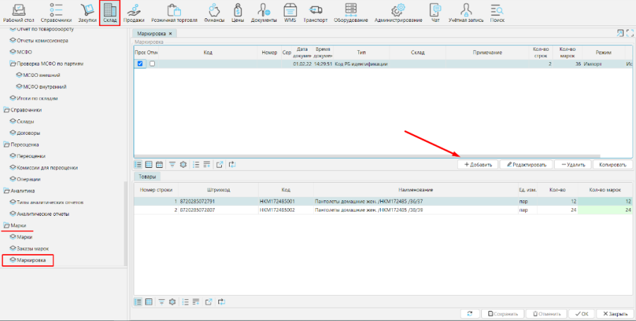 Также документ маркировки может быть создан вручную по кнопке Добавить на форме СкладМаркировка.