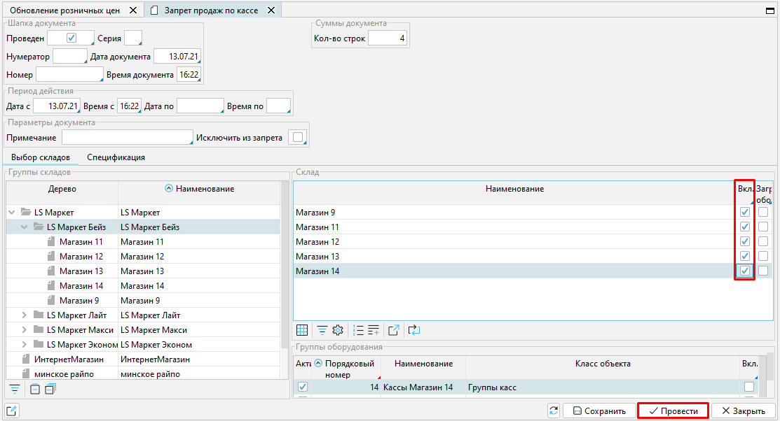 Все документы, связанные с включением и исключением товаров из стоп-листа, отражены на форме Оборудование – Запреты продаж по оборудованию.