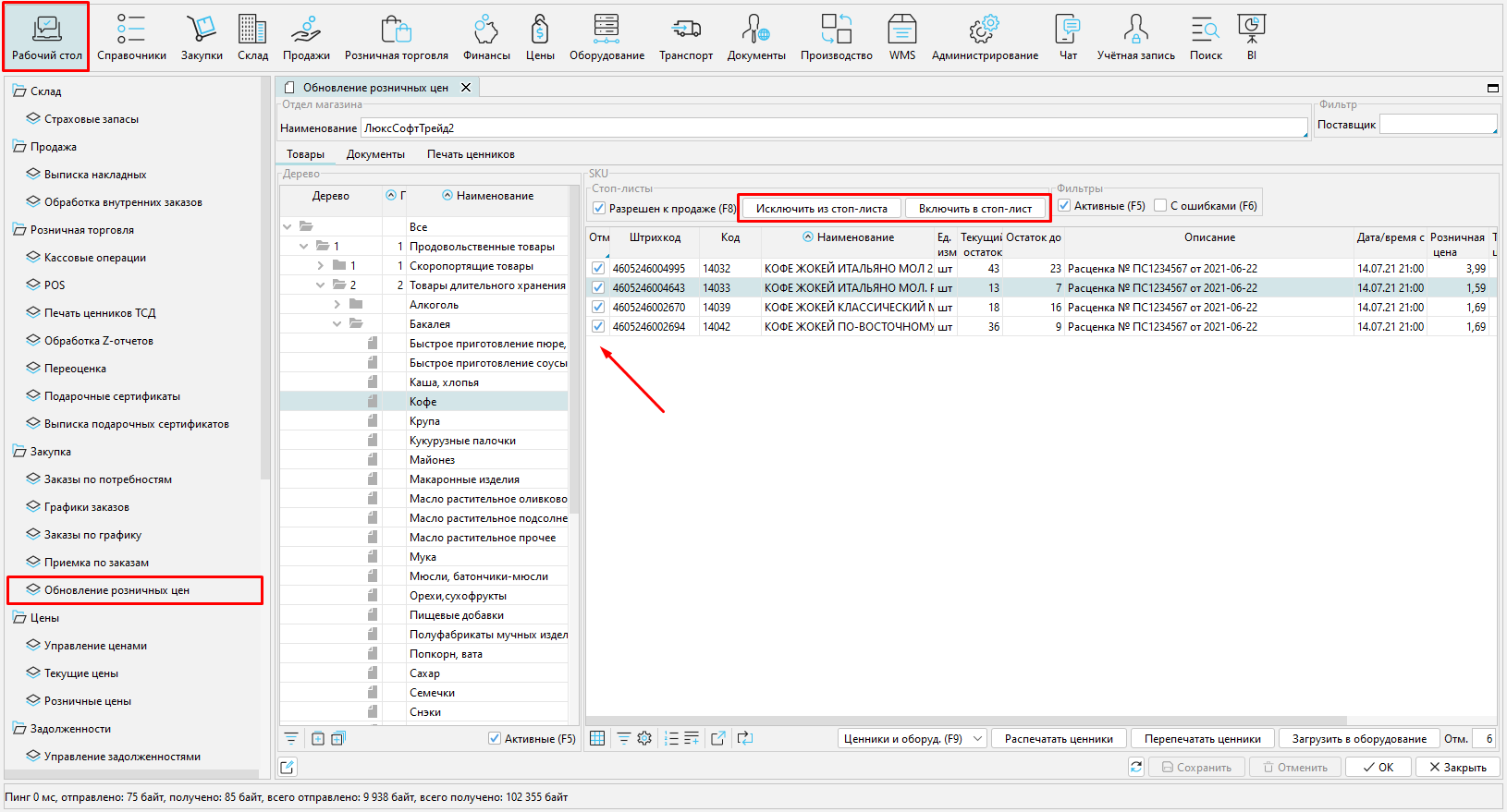 Для того, чтобы включить товары в стоп-лист (исключить из стоп-листа), необходимо перейти в Рабочий стол – Обновление розничных цен, отметить нужные позиции, предварительно отфильтровав их (при необходимости) с помощью дерева и (или) быстрых фильтров, и выбрать действие «Включить в стоп-лист» («Исключить из стоп-листа»).