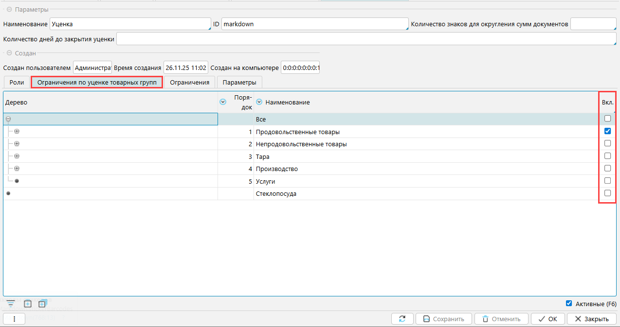 Можно отметить группы, на товары из которых не будет действовать текущая операция. При сохранении документа уценки будет отображаться предупреждение и документ не будет сохранен.