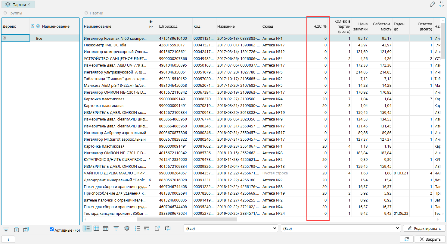 По одному и тому же товару НДС, который применяется для вашей компании и для поставщика, может отличаться. НДС поставщика заполняется в спецификации приходных документов и сохраняется как атрибут партии (рис. 4).