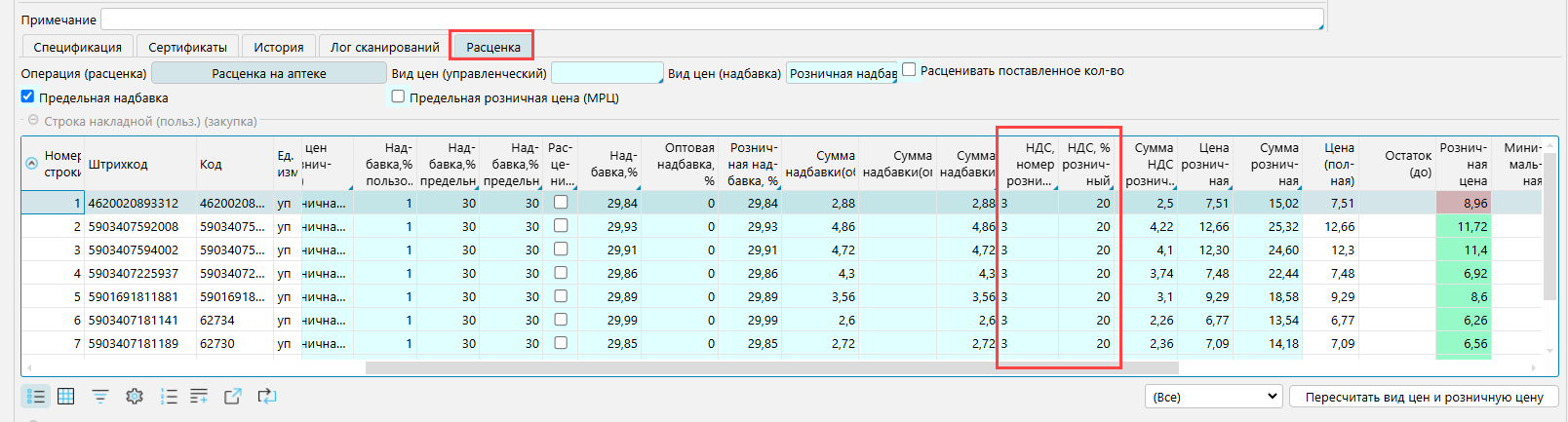Обратите внимание, что при расценке на приходе, на вкладке Расценка для формирования розничной цены используется НДС из карточки товара, даже если НДС поставщика отличается. Если задать НДС в расценке отличный от НДС в карточке товара, то по умолчанию система не позволит провести накладную и сформировать расценку.