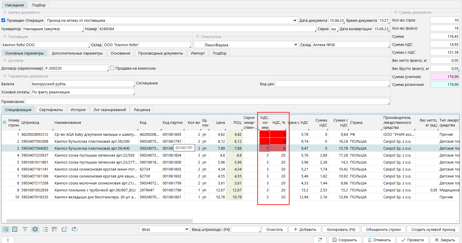 Рис. 6 Контроль НДС в приходной накладной
