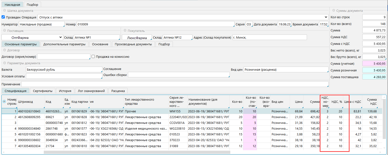 По умолчанию в накладную подтягивается НДС, указанный в карточке товара. Если поставщик работает с другим НДС, то его нужно изменить вручную (если накладные импортируются, то соответствующим образом настраивается импорт). Когда НДС в спецификации приходного документа (НДС поставщика) не совпадает с НДС в карточке товара (ваш НДС), то поле НДС подсвечивается красным (рис. 5). Подсветка информационная и никаких ограничений на документ не накладывает. Если есть необходимость, можно запретить проведение накладных, в которых НДС не соответствует НДС из карточки товара. Для этого в настройке операции закупки на вкладке Ограничения нужно отметить признак Проверять НДС товара в накладной.