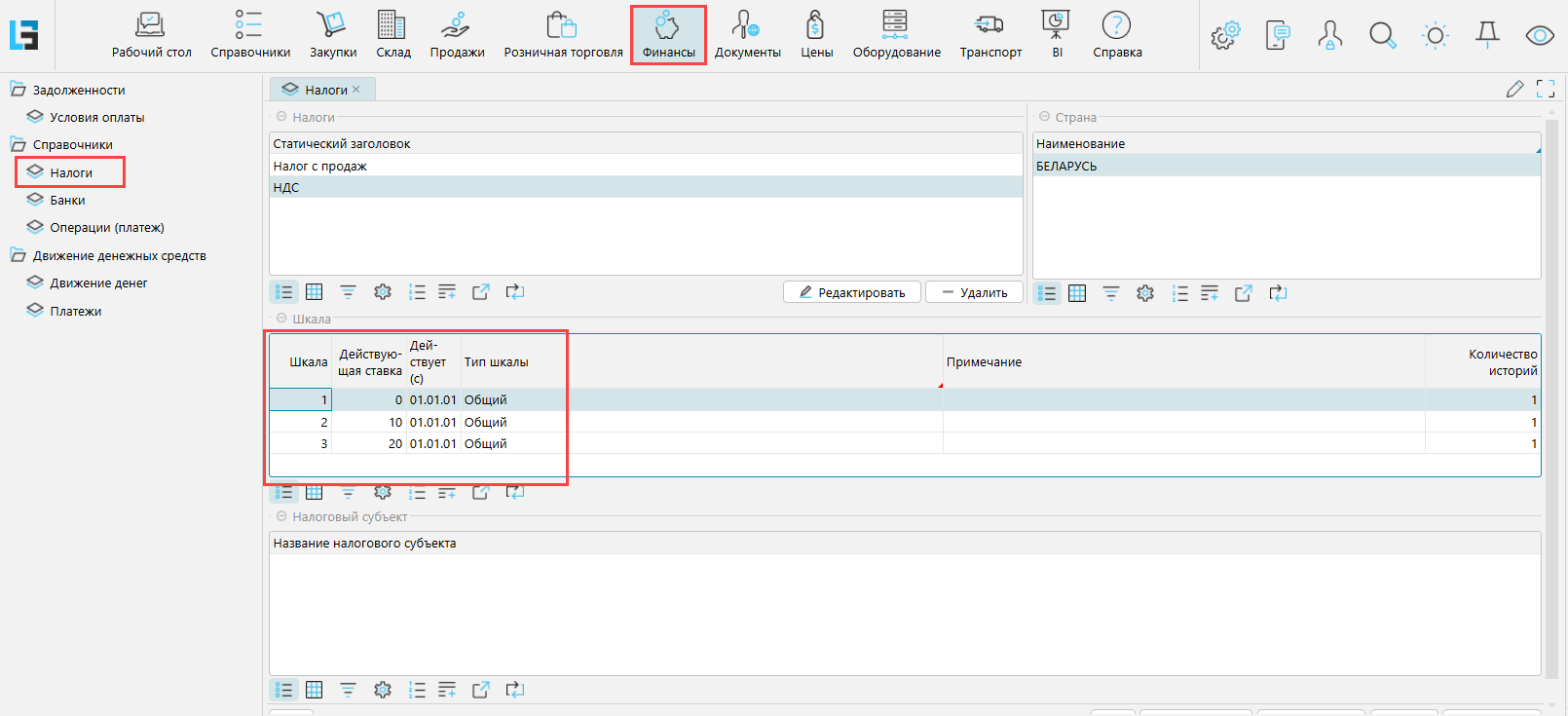 Действующие ставки НДС задаются в справочнике налогов на форме Финансы - Налоги.