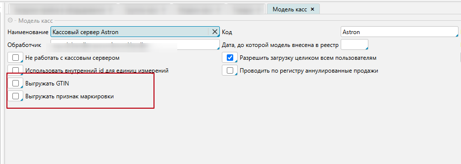 1) Для кассового сервера PowerPOS (Astron) для модели кассы нужно отметить признак Выгружать признак маркировки и признак Выгружать GTIN (касса проверяет gtin при маркировке)