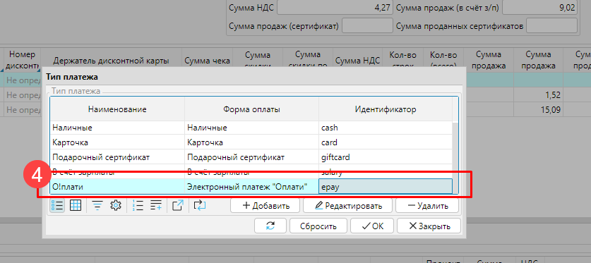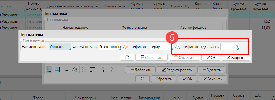 В поле Идентификатор для кассы укажите номер данного типа платежа, настроенный на кассе (1, 2, 3 и т.п.). Нажмите ОК.