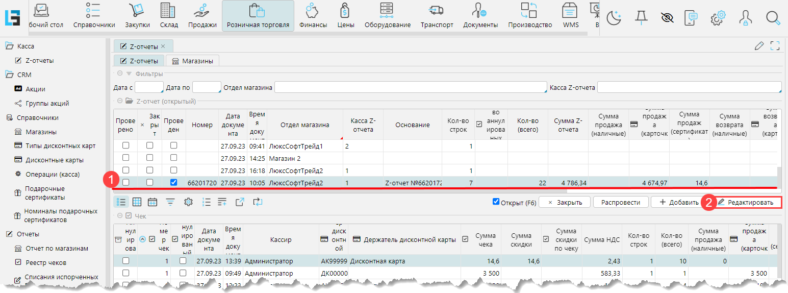 Также необходимо также указать вид оплаты для данного платежа в соответствии с настроенным на кассе (1, 2, 3 и т.п.). Для этого в Розничная торговля - Z-отчеты необходимо открыть на редактирование какой-нибудь отчет и в любом чеке кликнуть в поле Тип платежа.