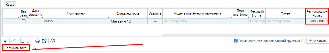 Далее в настройках кассы (Оборудование - Группы касс - Редактировать) необходимо указать Регистрационный номер кассы. После этого появится кнопка Получить токен. Нажмите на кнопку и поле Токен будет заполнено.