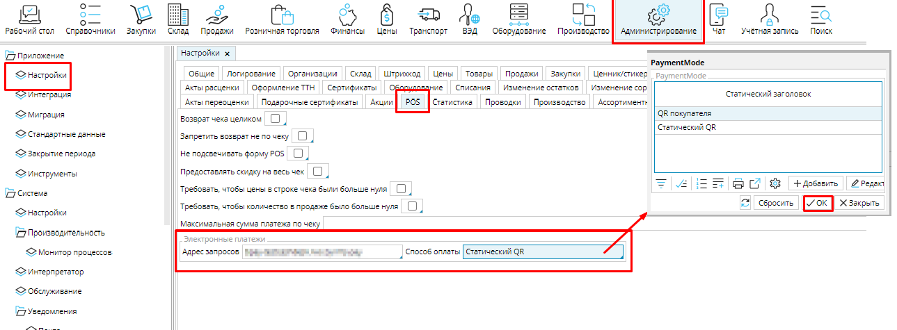 Настройка платежей О!плати осуществляется на форме Администрирование - Настройки - POS в секции Электронные платежи.