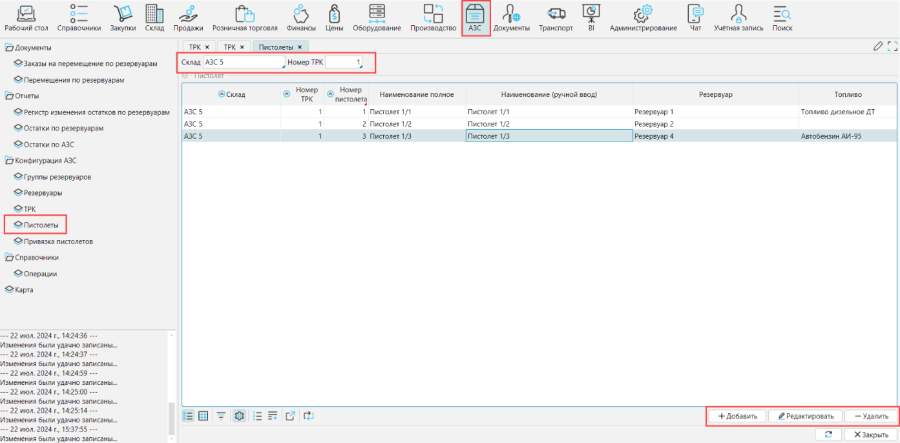 Далее на форме АЗСПистолеты вводим по каждой ТРК пистолеты. На форме удобно отфильтровывать отображение пистолетов по Складу и ТРК.