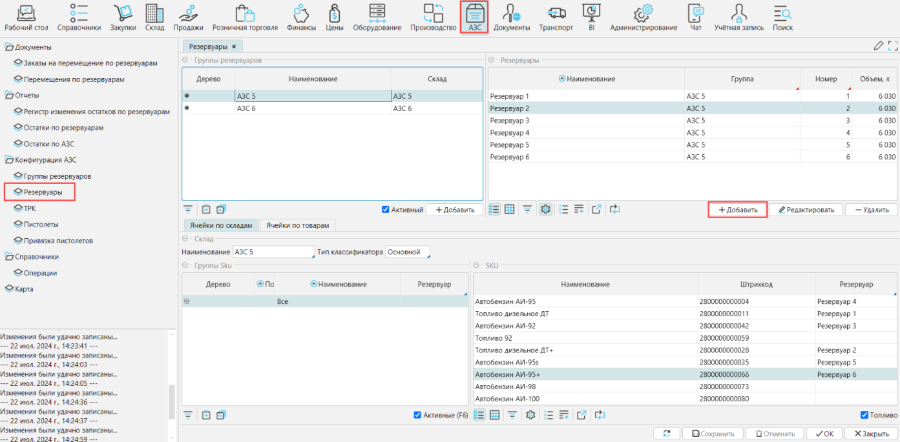 На форме АЗСРезервуары создается конфигурация резервуаров по каждой группе. В блоке Резервуары нужно нажать кнопку Добавить и заполнить данные для нового резервуара: