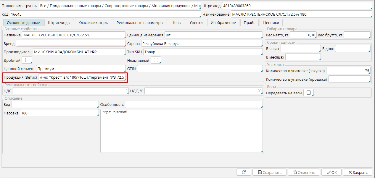 Привязка товаров: привязка между товаром в lsFusion и продукцией Ветис создается автоматически по GTIN. Если привязка не создалась по каким-либо причинам, то ее можно  создать вручную. В карточке товара (Справочники - Товары) указать соответствующий продукт в поле Продукция (Ветис)