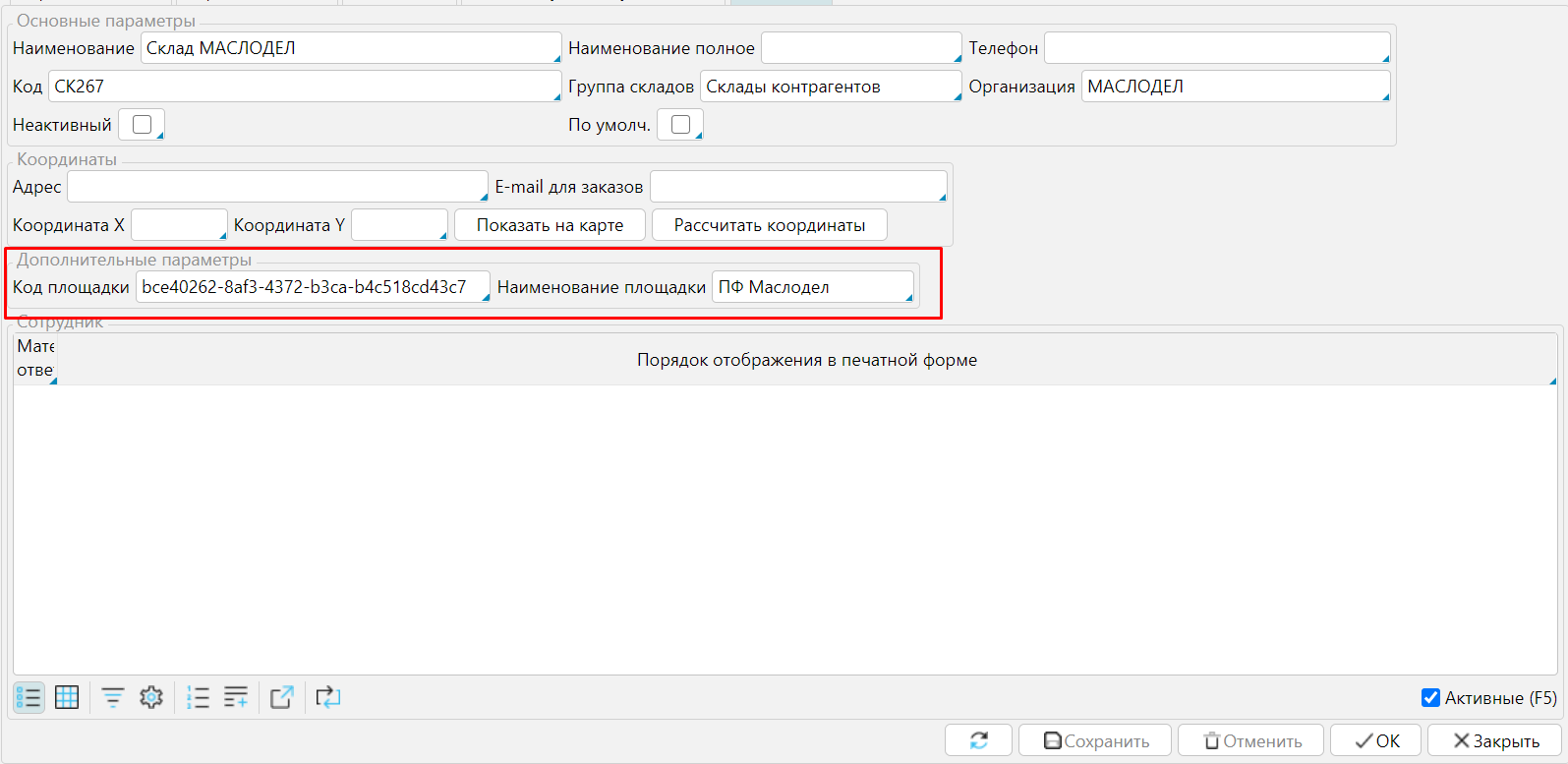 Привязка склада/отдела магазина производится аналогично. Поднимается на редактирование карточка склада или отдела магагазина (из карточки организации или Склад - Справочники - Склады или Розничная торговля- Справочники - Магазины) и в  поле Код **площадки ** указывается GUID площадки.