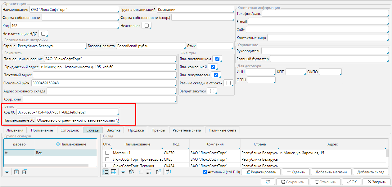 Далее необходимо привязать  ХС к соответствующим организациям в справочнике организаций, включая привязку собственных ХС к компаниям, а площадки привязать к складам или отделам магазинов.