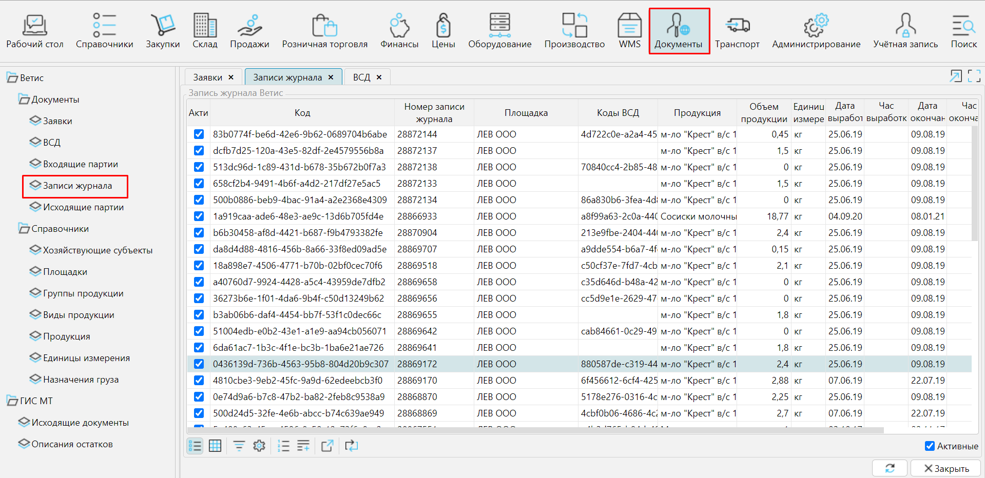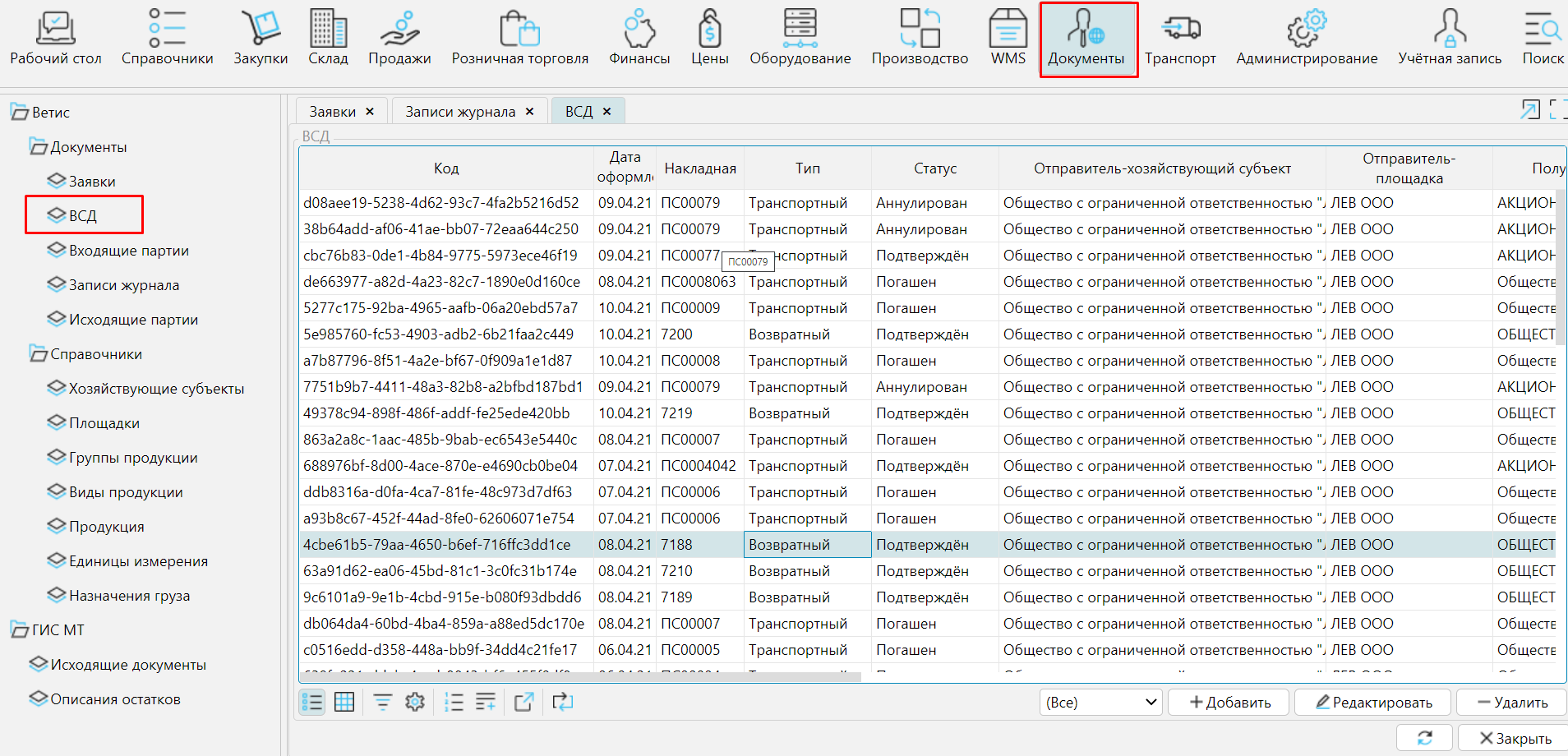 Полученные данные будут отражены на формах  Документы - Ветис - ВСД и Документы - Ветис - Записи журнала.
