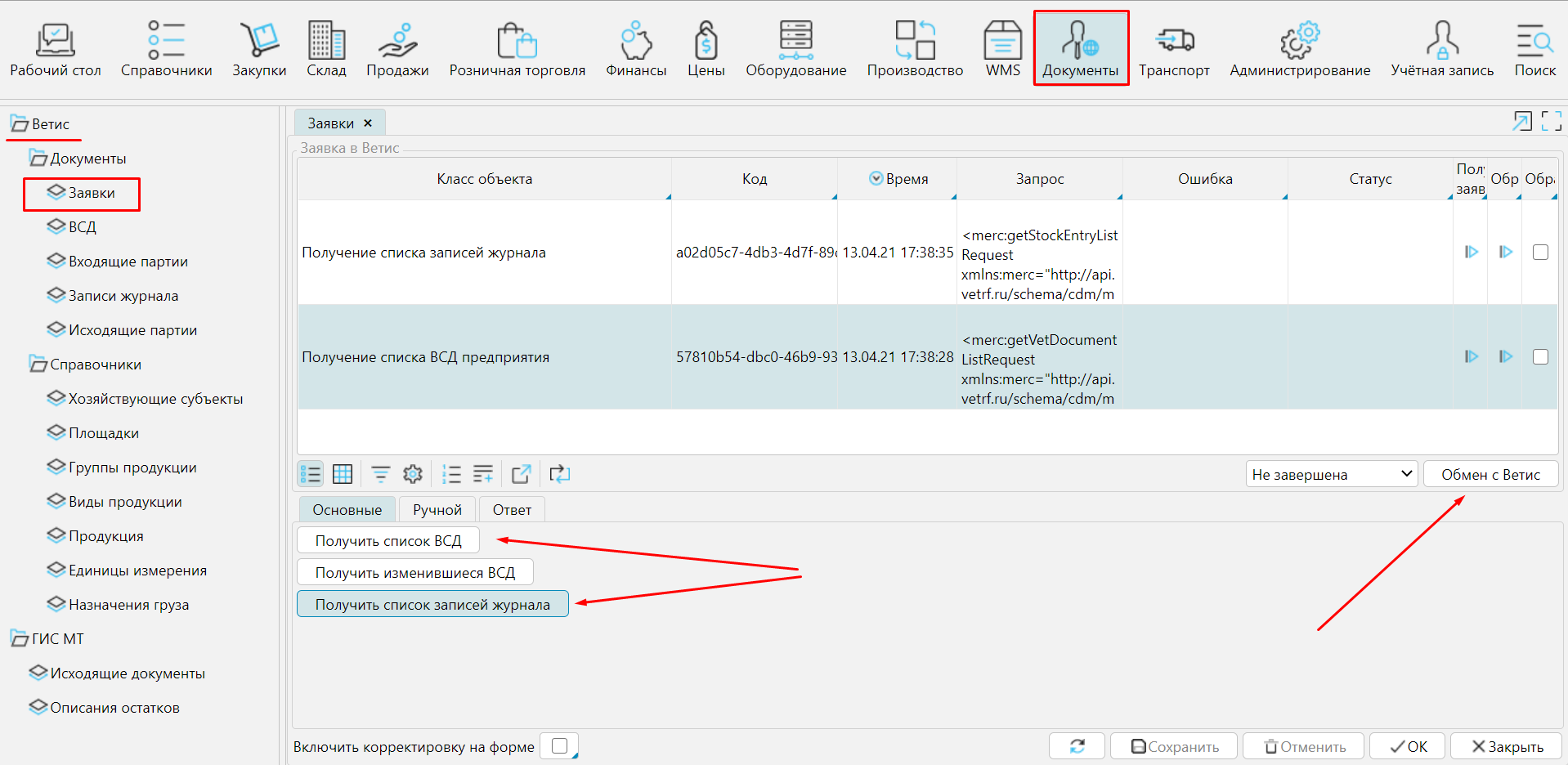 После настройки интеграции и собственного ХС необходимо загрузить из системы "Меркурий" список ВСД и записей складского журнала.  На форме Документы - Ветис - Заявки кнопками Получить список ВСД и Получить список записей журнала формируются соответствующие запросы. Далее необходимо нажать кнопку Обмен с Ветис.
