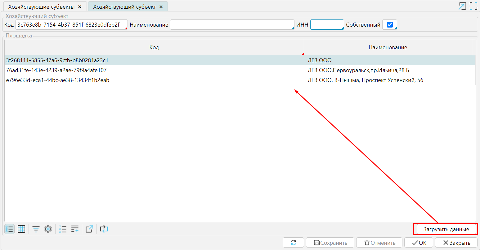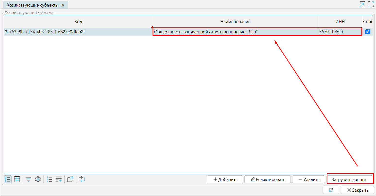 Если  Наименование и **ИНН **не были указаны, на форме Документы - Хозяйствующие субъекты нажмите кнопку  **Загрузить данные **и они заполняться автоматически.