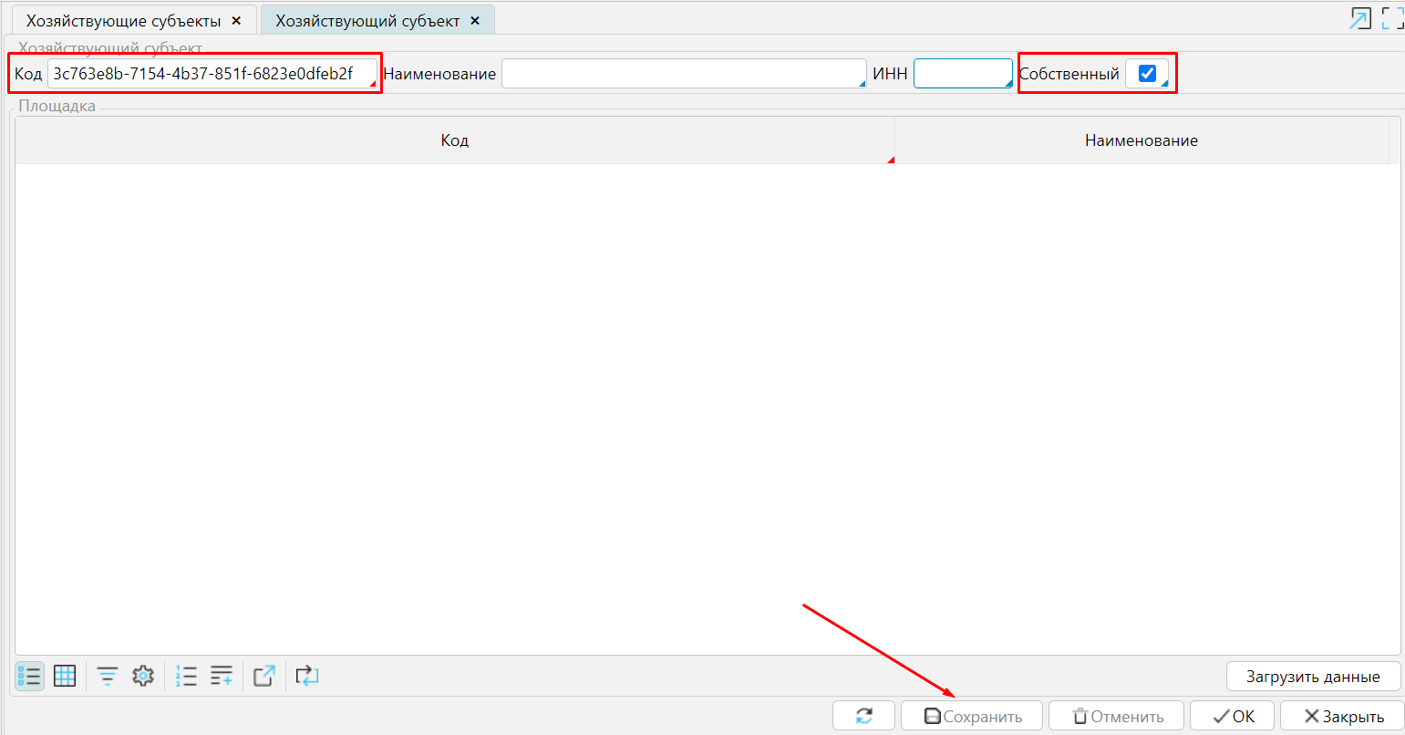 В открывшейся форме ХС обязательно ввести GUID ХС в поле Код и отметить признак Собственный. Наименование и ИНН ХС указывать не обязательно Сохранить изменения.