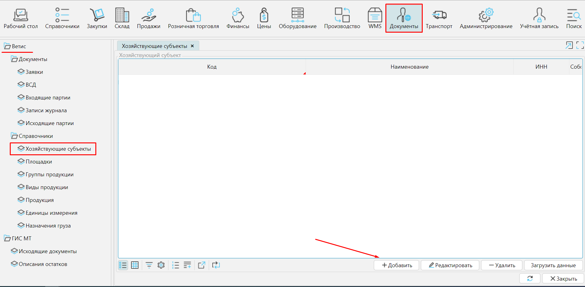 На форме Документы - Ветис - Хозяйствующие субъекты необходимо внести данные о собственном хозяйствующем субъекте. Для этого используют кнопку Добавить.