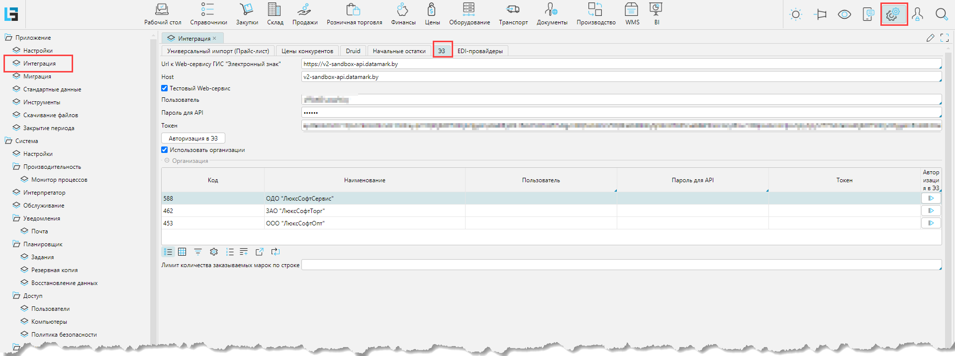 Настройки для интеграции с ГИС "Электронный знак"