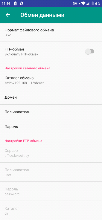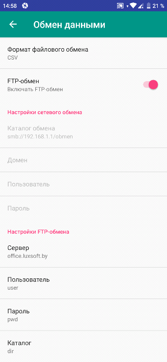 - FTP-обмен – включает механизм обмена через FTP-сервер и открывает настройки FTP-сервера.