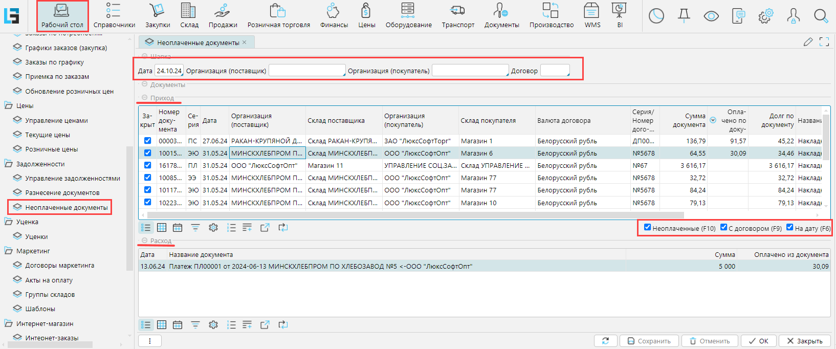Неоплаченные - отображаются только документы, которые не погашены, или погашены частично, если снять фильтр, отобразятся также оплаченные документы.