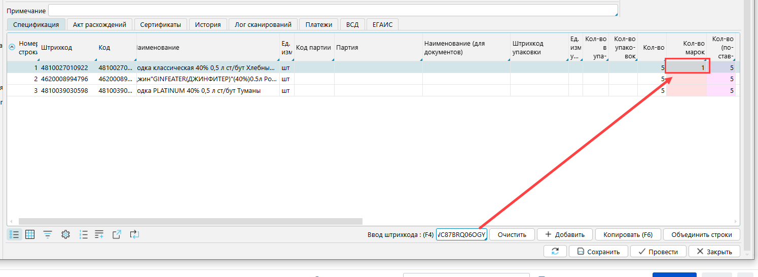 Использовать сканер штрихкодов и сканировать алкогольные марки непосредственно в документ. Для этого поле Кол-во марок должно быть активным, код маркировки сканируется в поле штрихкод.