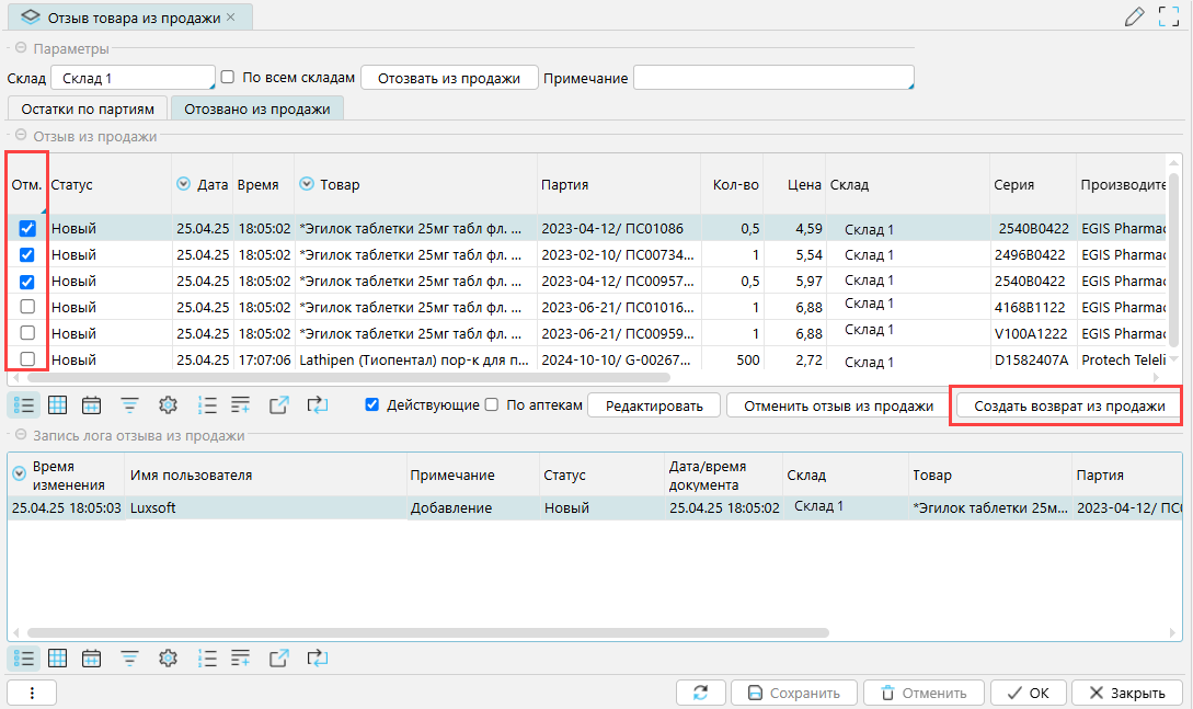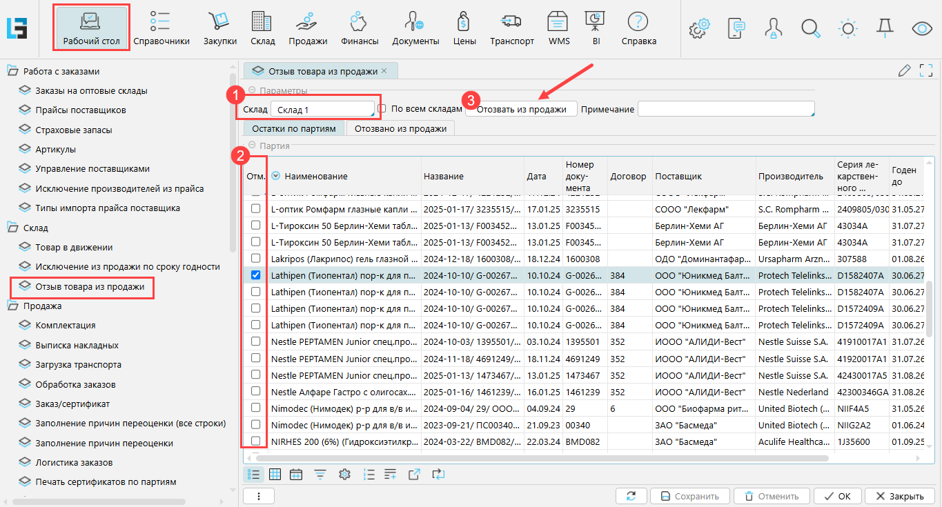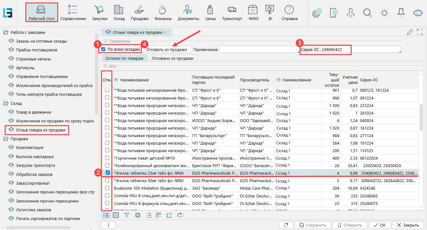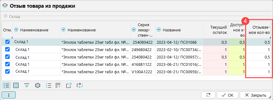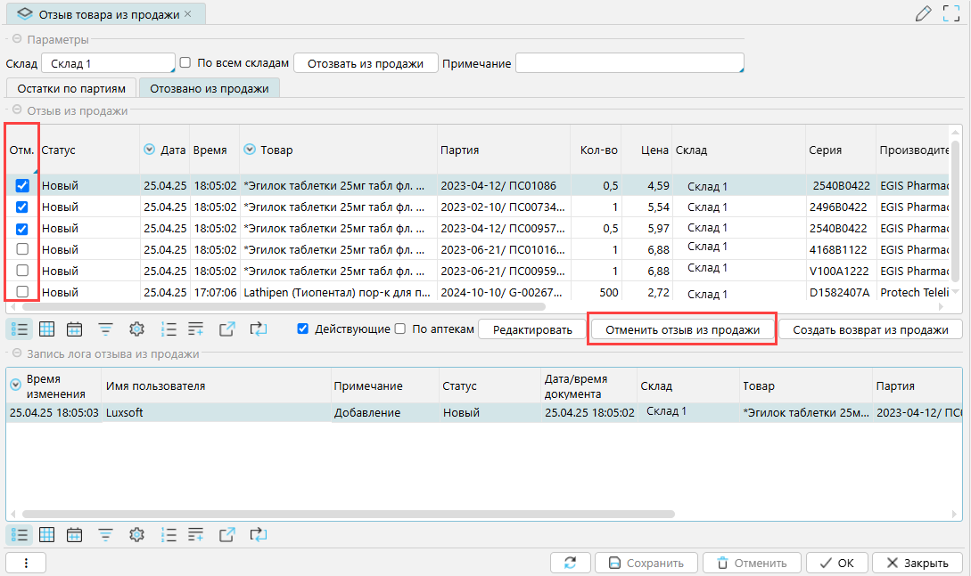 - В поле Отм. отметить те товары, которые нужно изъять из продажи. Программа отзовет все партии в наличии по всем складам.
