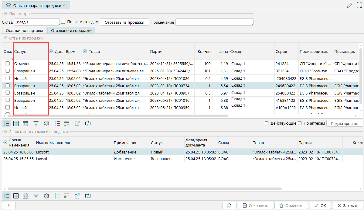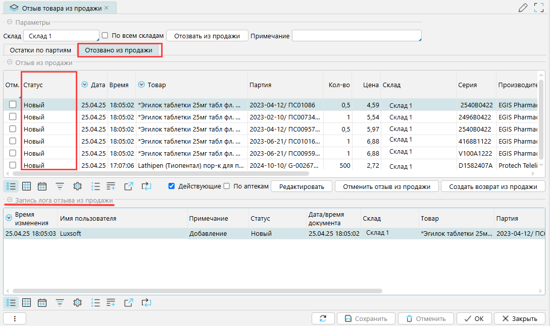 Система создаст заполненные проведенные накладные закупка-возврат для выделенных партий. Возвраты отобразятся также на форме Закупки - Накладные (закупка-возврат). Отзыв товаров перейдет в статус Возвращен и действие возврата отобразится в логе (рис. 9).
