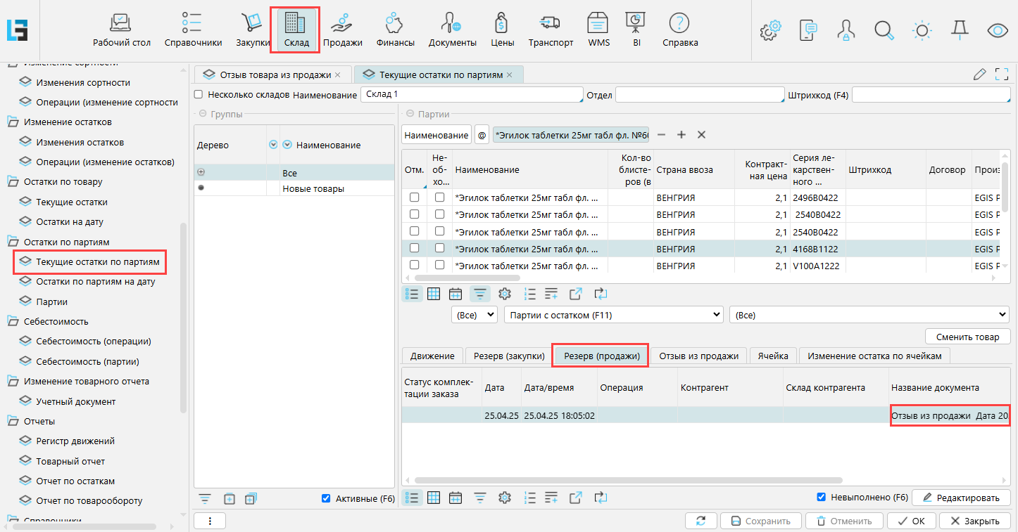 - В поле Склад указать склад или аптеку, где нужно изъять товар из продажи. На вкладке Остатки по партиям отобразятся все партии товара в наличии на складе.