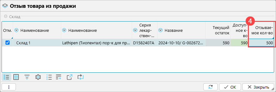 Рис. 2 Отзыв товара из продажи по всем складам - Откроется окно, в котором отобразится Текущий остаток, Доступное количество и Отзываемое количество по всем подходящим партиям. Отзываемое количество можно изменить.
