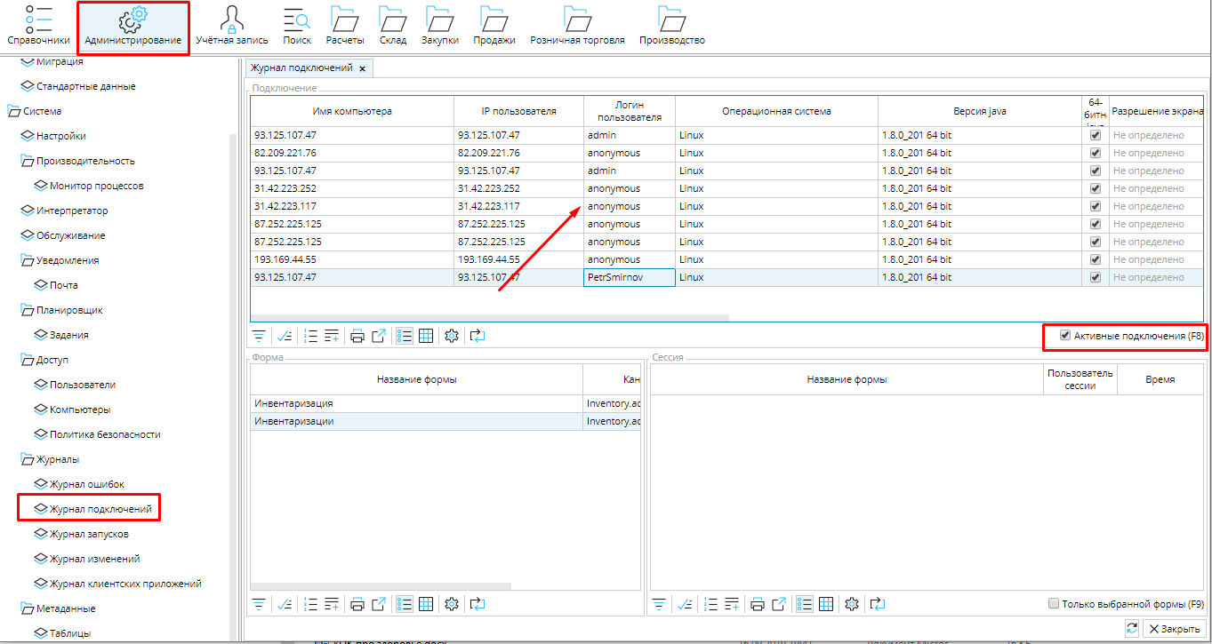 Если лицензионное соглашение содержит условие по количеству конкурентных пользователей, то данное ограничение распространяется на количество пользователей, использующих десктопное приложение и/или web-интерфейс. При определении количества подключений подсчитываются только активные подключения пользователей к серверу приложений и не учитываются подключения с терминалами сбора данных (ТСД). Текущие подключения пользователей можно просмотреть на форме Журнал подключений в модуле Администрирование