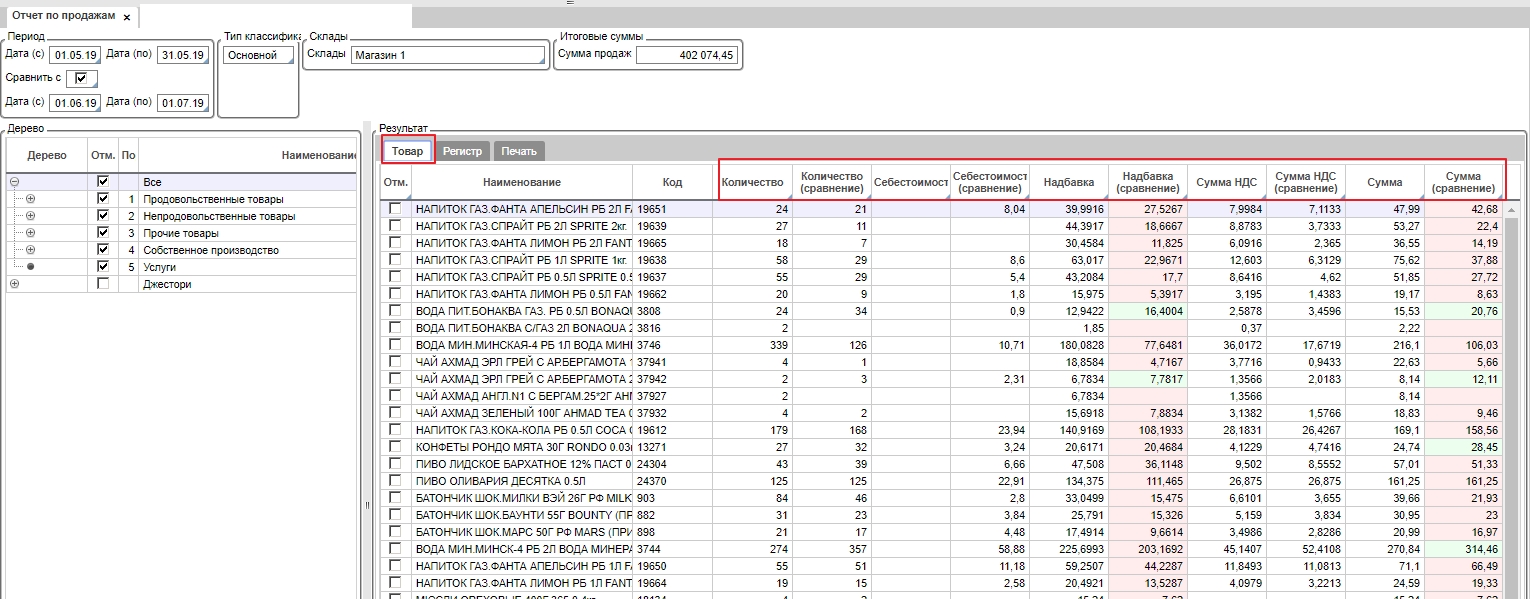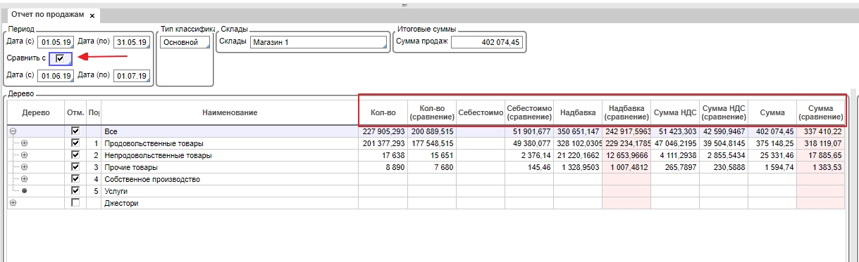 для ввода интервала дат для сравнения, необходимо поставить галочку Сравнить с и в открывшихся полях ввода дат ввести даты. После чего, для выбранного классификатора просчитаются суммы.