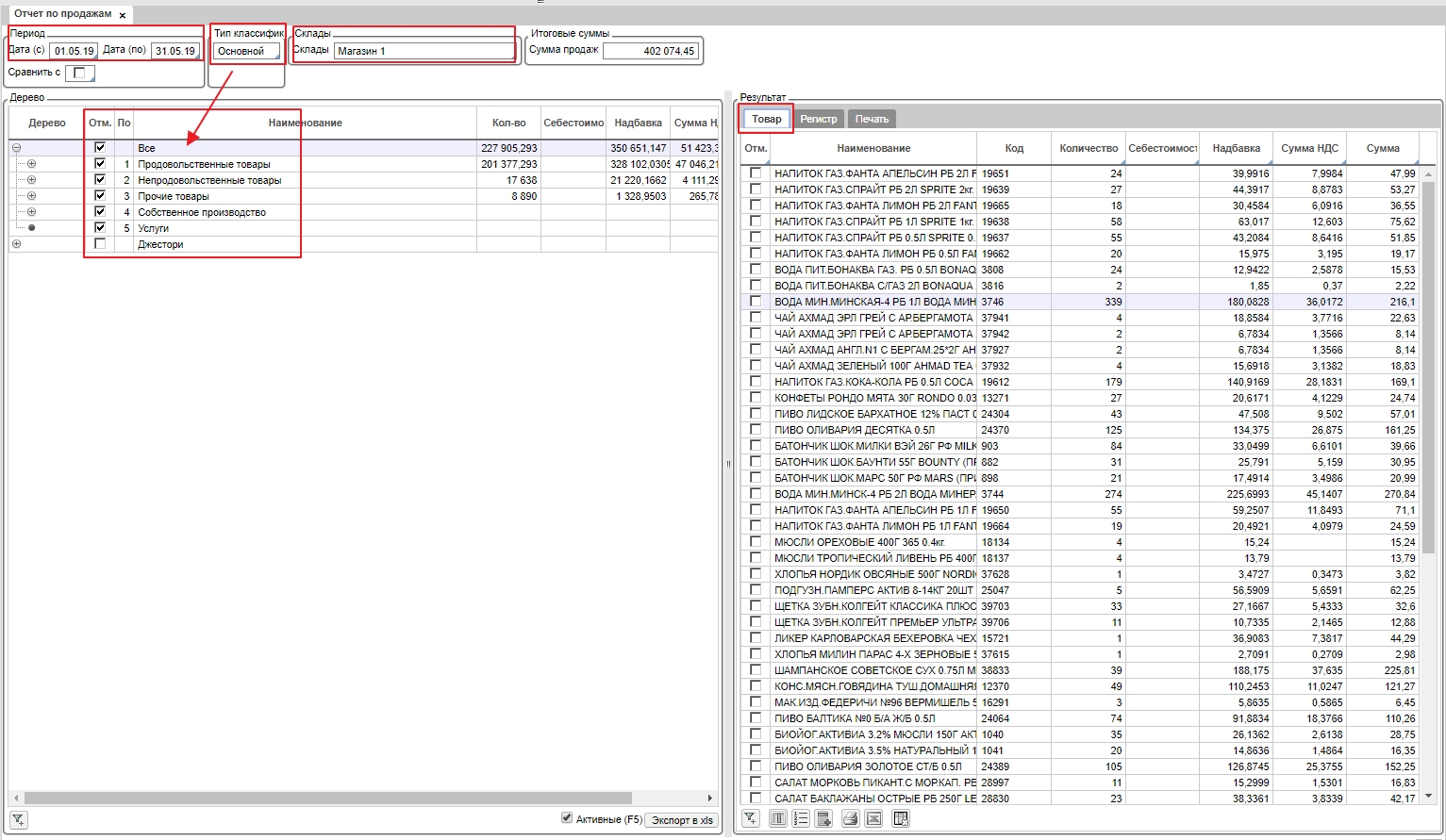 Для получения данных, необходимо ввести интервал дат, выбрать тип классификатора и отметить группы в дереве, выбрать склад.