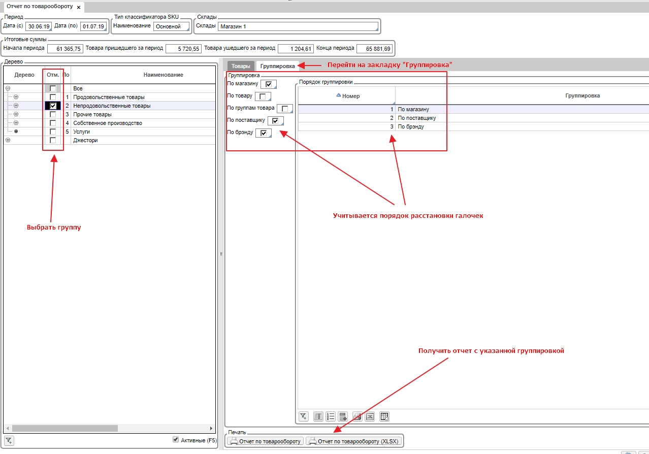 Также на форме Отчет по товарообороту есть возможность задавать дополнительную группировку данных для конкретных групп выбранного классификатора.