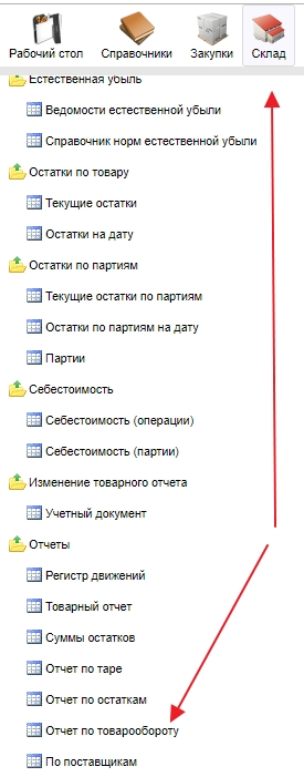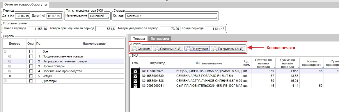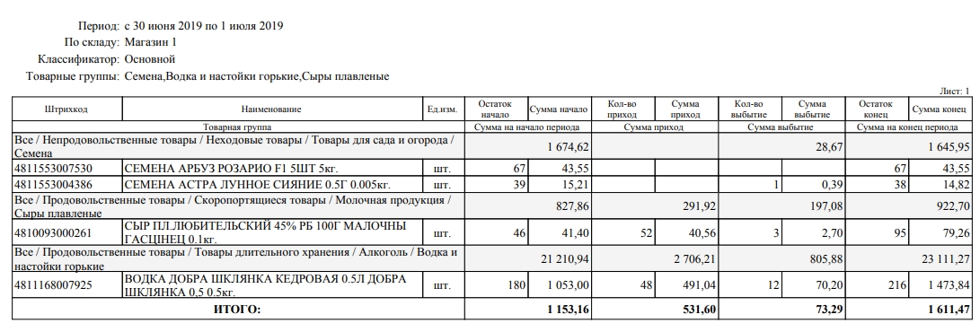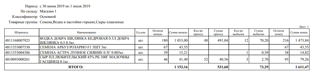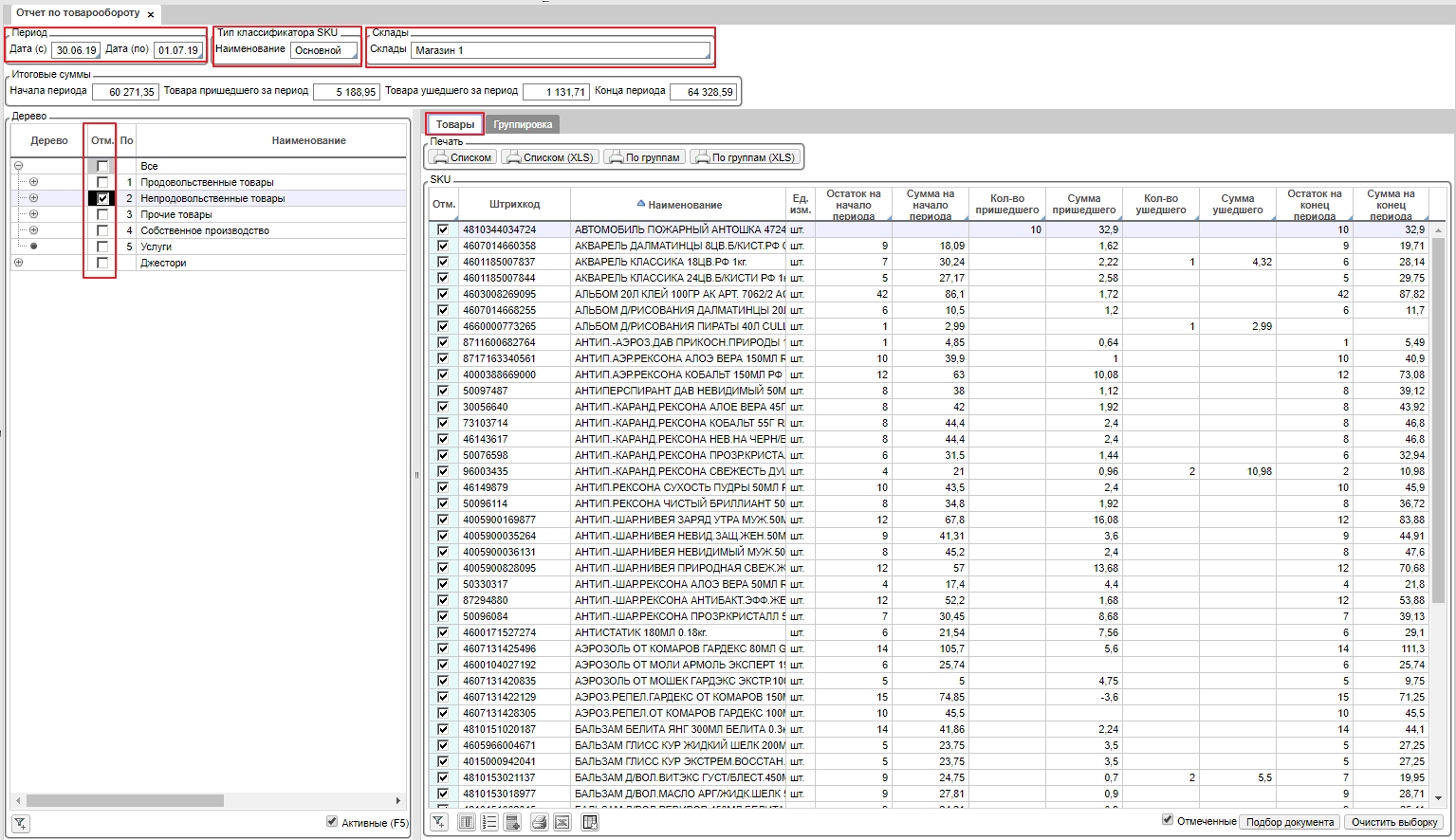 В указанной форме необходимо ввести интервал дат, выбрать классификатор и отметить галочками группы, по которым необходимо получить данные,выбрать склады.