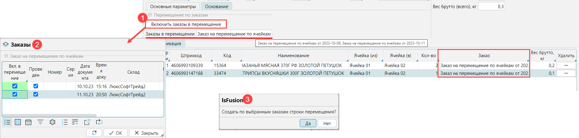 1. нажать Включить заказы в перемещение