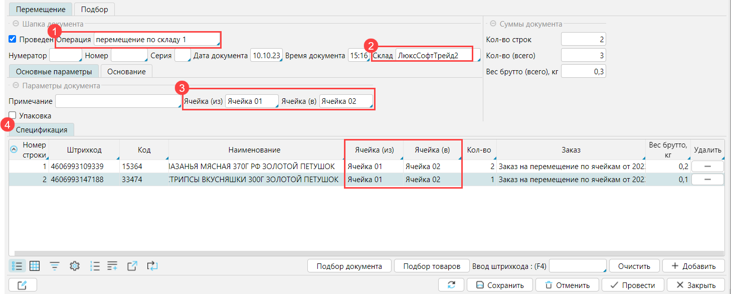 Спецификация - заполнить спецификацию товарами, которые нужно переместить.  указать их количество. Ячейка(из)/(в) заполнится автоматически в соответствии с шапкой документа, однако эти данные можно изменить по необходимости.