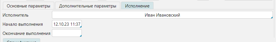 На вкладке Исполнение можно фиксировать исполнителя заказа, время начала и окончания выполнения.