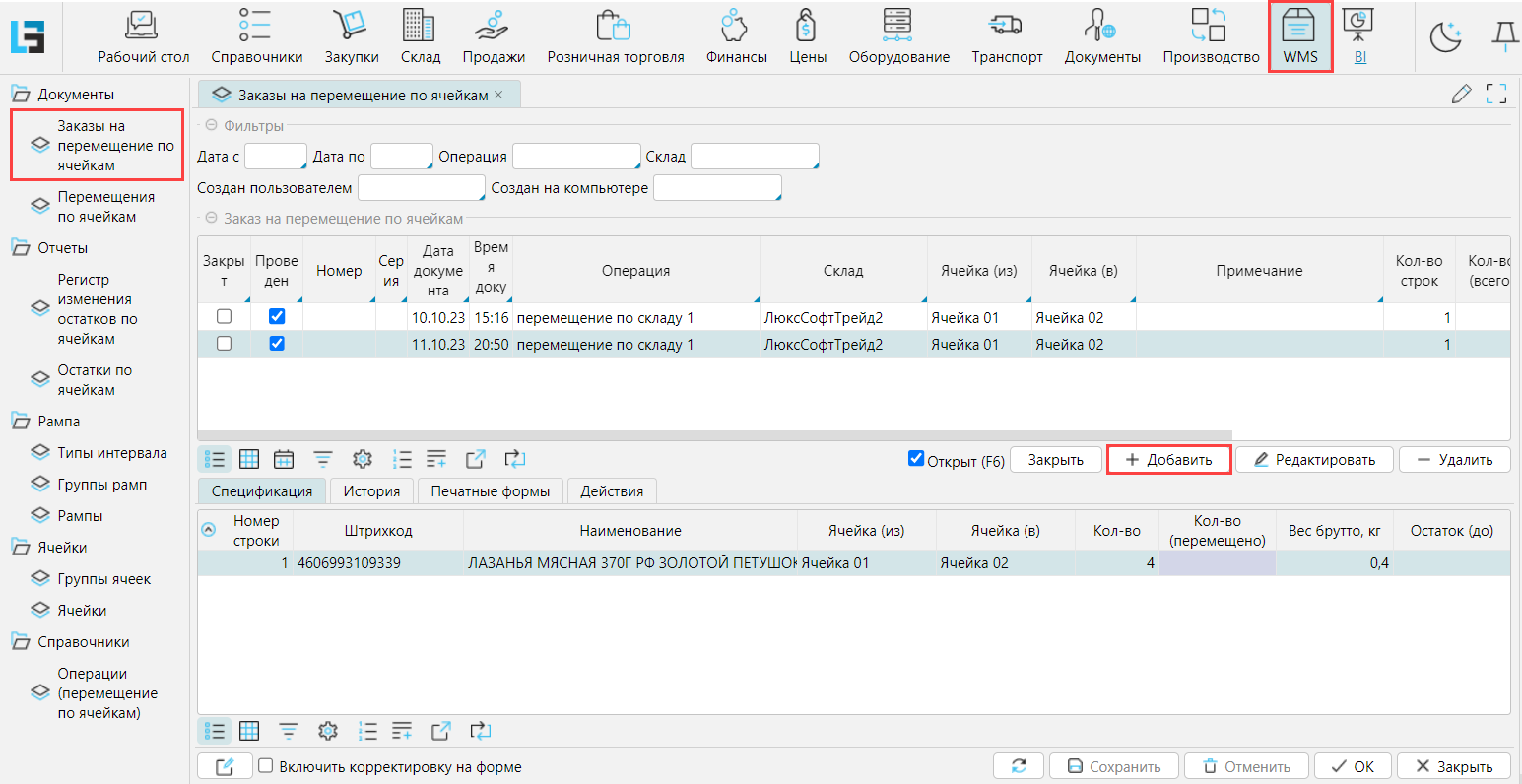 Заказы отображаются на форме WMS - Заказы на перемещение по ячейкам. Для создания нового используется кнопка Добавить