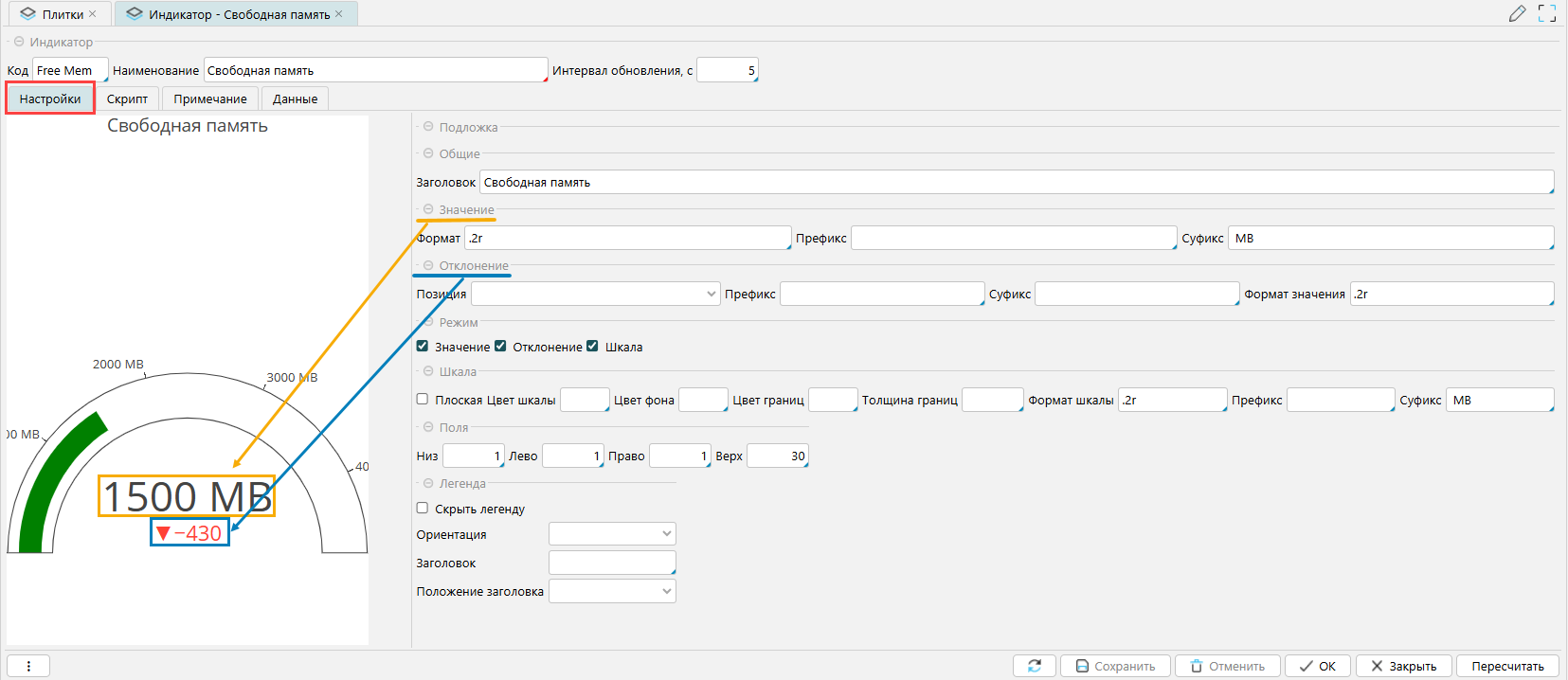 На плитке отображается значение показателя в виде числа. Отображение индикатора регулируется на вкладке **Настройки **(рис. 14). Слева отображается как будет выглядеть плитка. Чтобы было изображение, должен быть заполнен код расчета показателя на вкладке Скрипт.