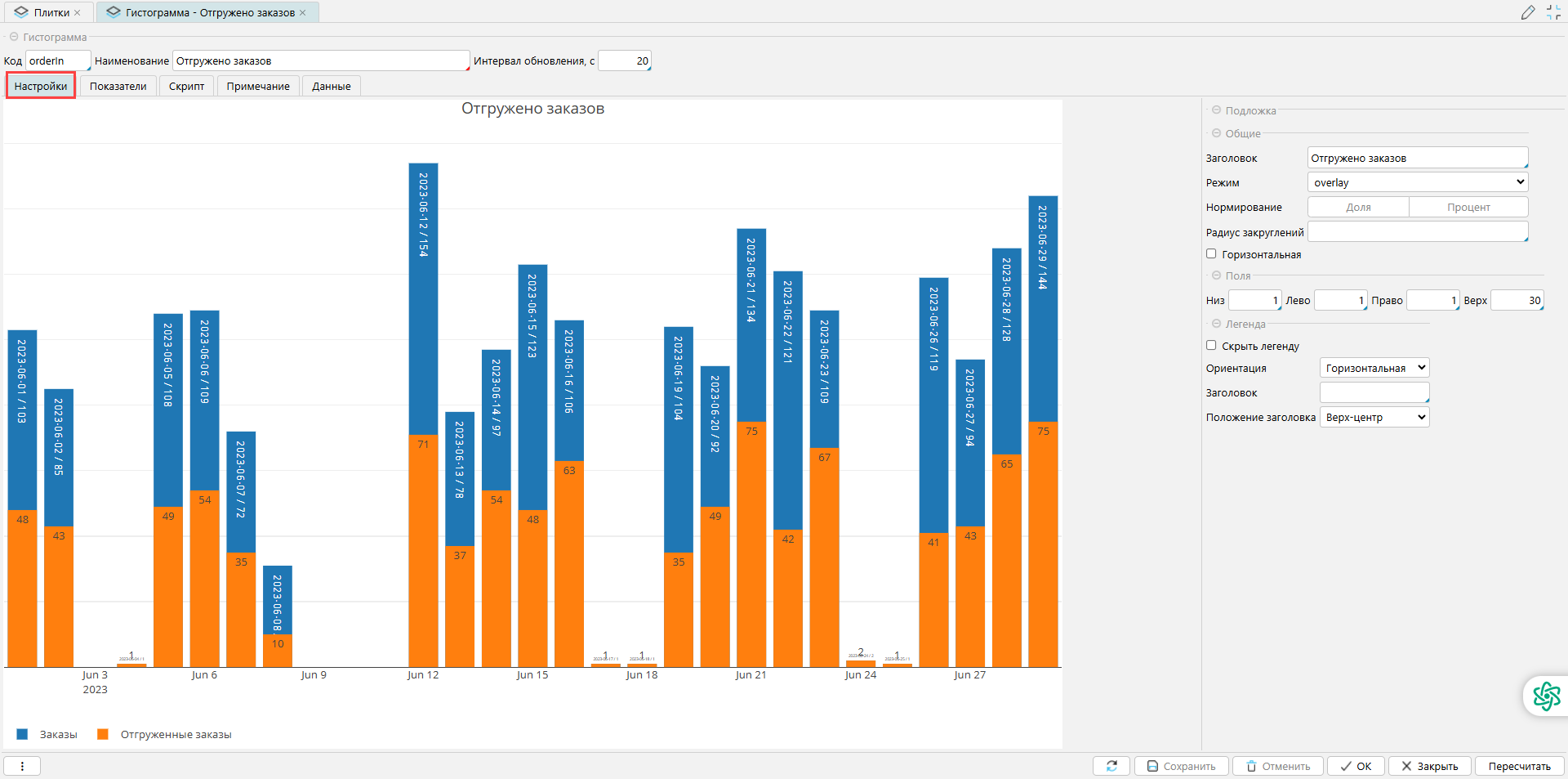Данные на плитке представлены в виде одного из 4-х типов гистограммы, вид которой настраивается на вкладках Настройки (рис.9) и Показатели (рис. 11). Слева отображается как будет выглядеть плитка. Чтобы было изображение, должен быть заполнен код расчета показателей на вкладке Скрипт.