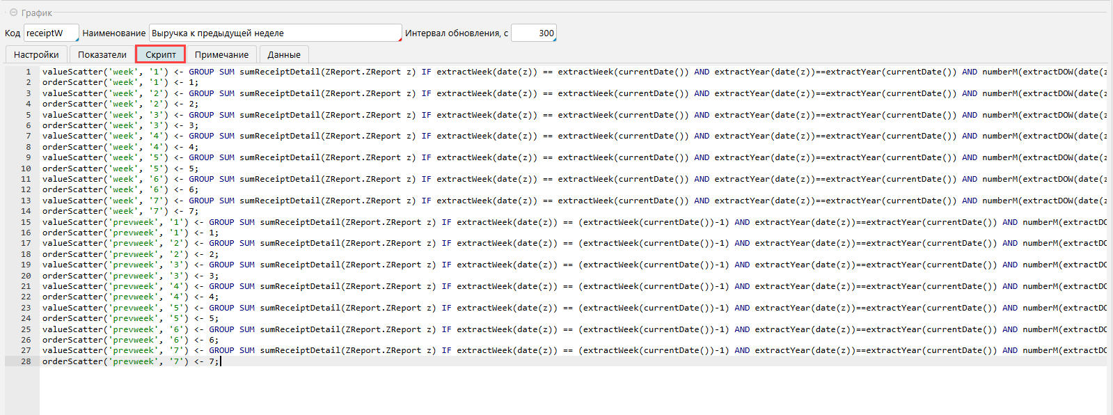 Рис. 8 Скрипт для построения графиков выручки за текущую и предыдущую неделю