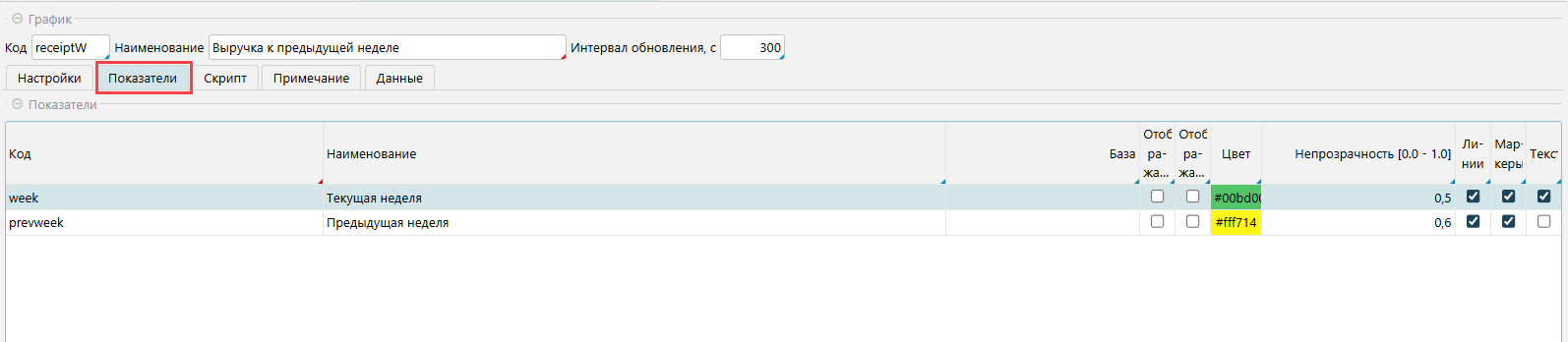 Для каждого показателя строится свой график. Количество показателей неограничено. Для показателей указывают следующие параметры: