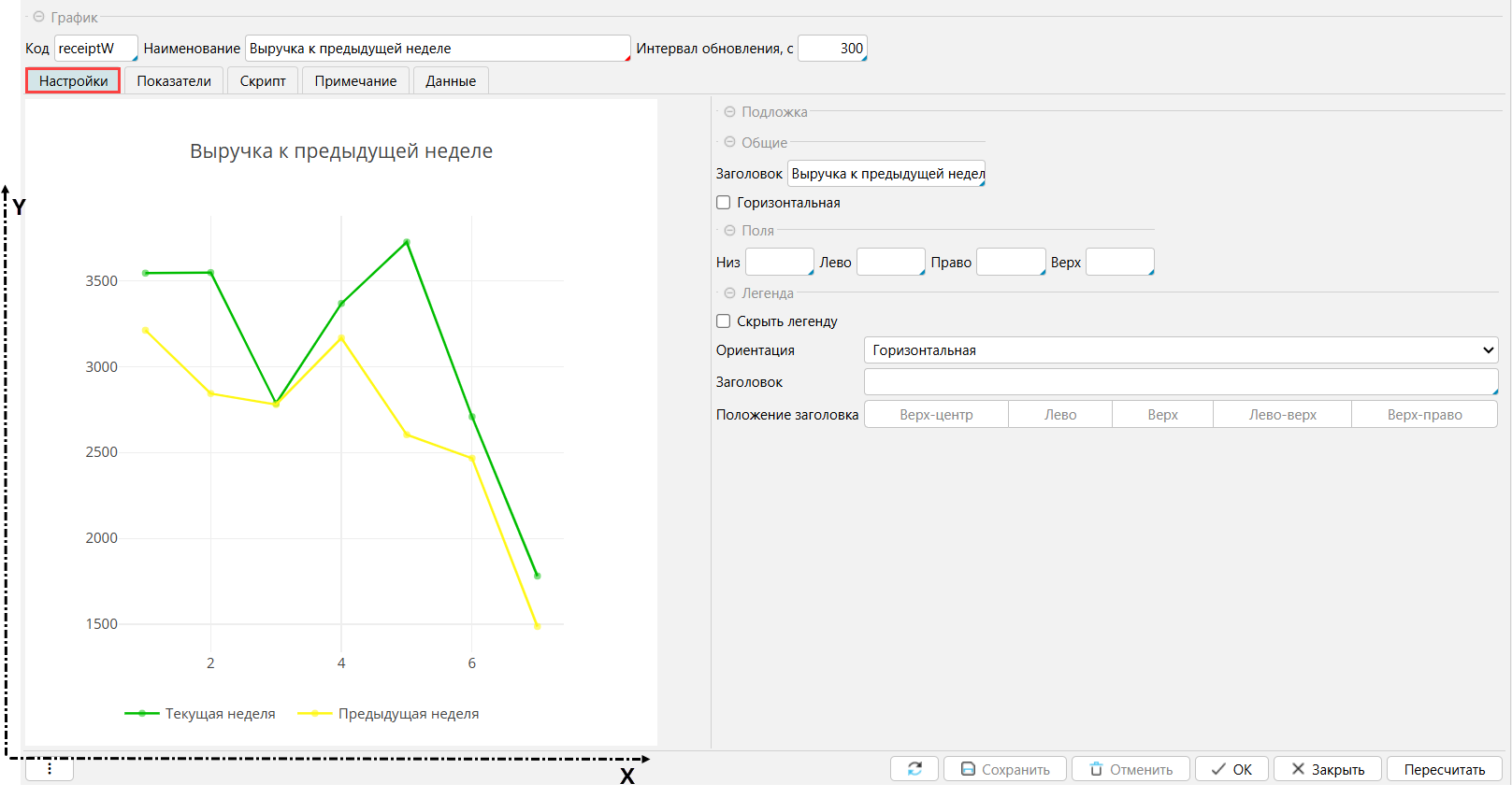 Данные на плитке представлены в виде графика(ов), вид которого настраивается на вкладках Настройки (рис.5) и Показатели (рис. 6). Слева отображается, как будет выглядеть плитка. Если настроен один показатель, то на плитке будет отображаться один график, если показателей несколько, то для каждого показателя будет отдельный график, но все графики располагаются в одной системе координат (рис. 5).