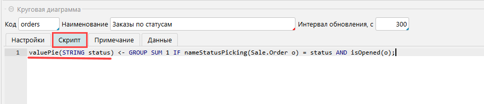 На рис. 4 приведен пример кода, который отображает в виде круговой диаграммы количество заказов по статусам (status). В диаграмме отображается столько секторов, сколько статусов система найдет в активных заказах. На рис. 3 отображена диаграмма по скрипту рис. 4 с четырьмя секторами, значит в системе на момент построения диаграммы были заказы в 4 разных статусах. Размер каждого сектора зависит от количества заказов в каждом статусе.